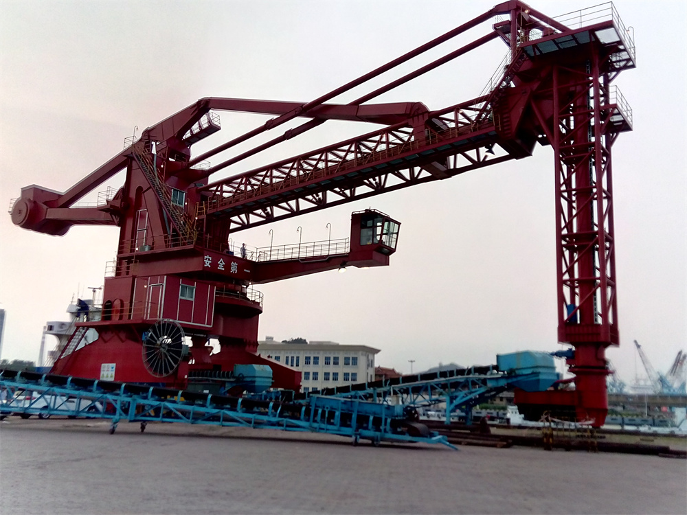 固定旋轉(zhuǎn)式:安裝在碼頭岸邊固定基礎上,依靠水平臂繞回轉(zhuǎn)塔旋轉(zhuǎn)與垂直取料器提取料。